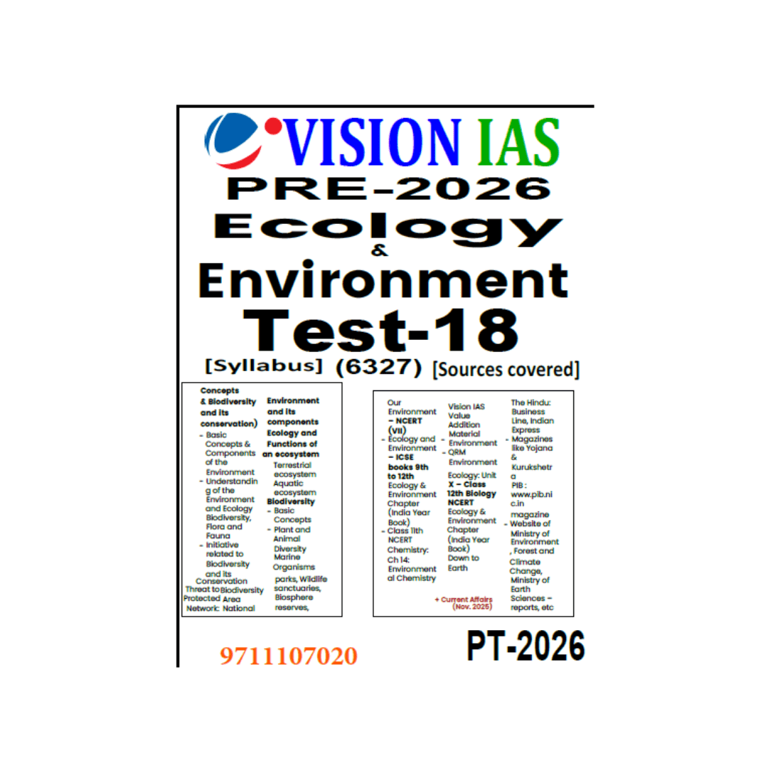 Vision IAS Prelims 2026 – Ecology & Environment Test-18 is a comprehensive practice test designed specifically for UPSC Civil Services Prelims 2026 aspirants. This test covers the complete Ecology and Environment syllabus, including biodiversity, ecosystems, environmental components, conservation initiatives, protected areas, climate change, and current environmental issues.
